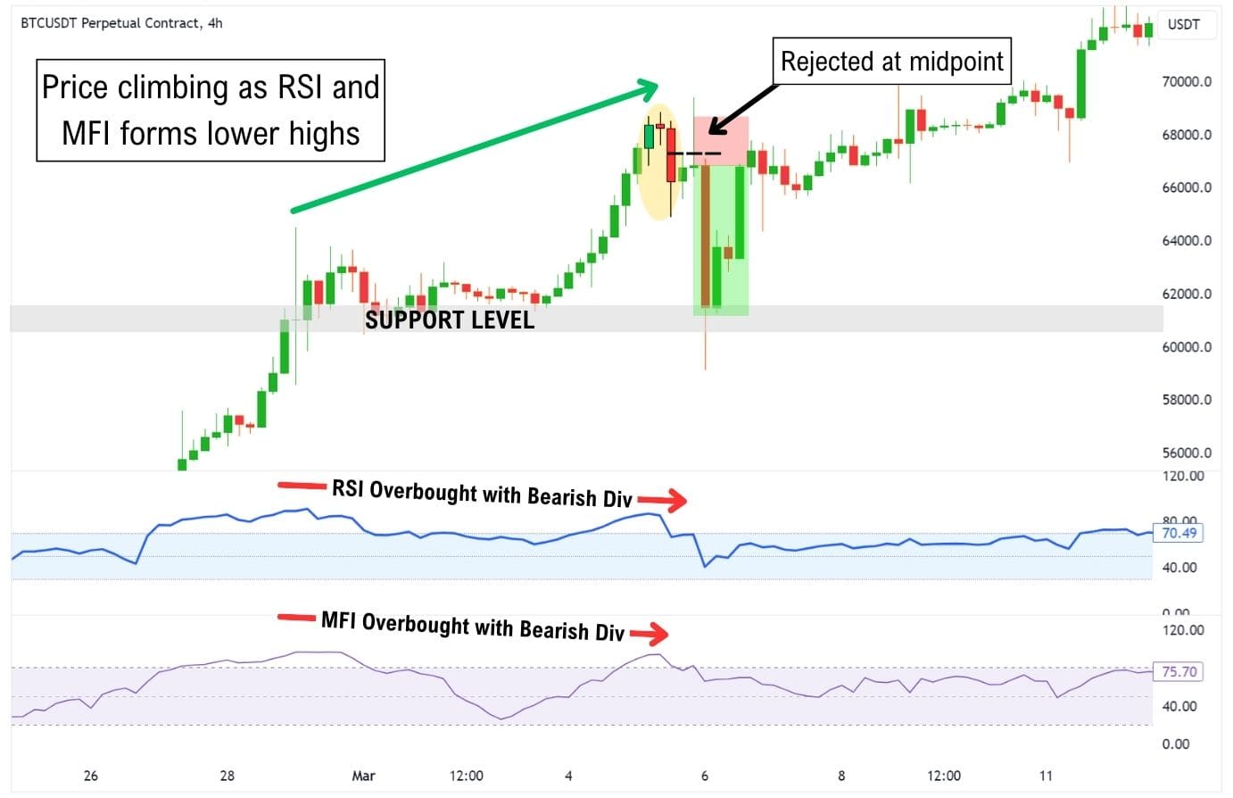 3. Check for overbought, bearish divergence conditions on oscillators. This can be paired with indicators like the RSI, stochastic RSI, or MFI. More on this in the strategy section.