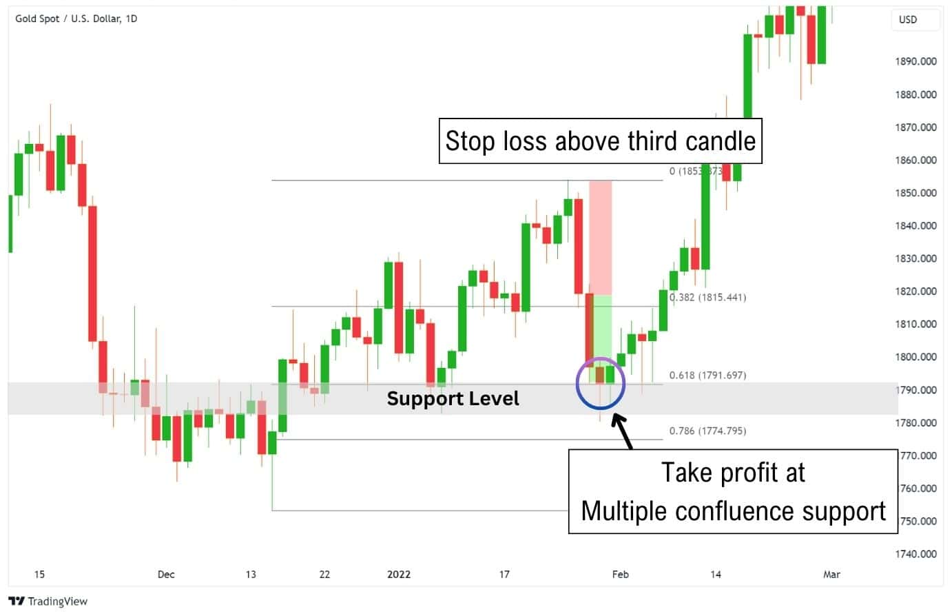 A general tip is to watch where multiple support levels overlap. Prices are typically more likely to bounce from a support zone with multiple confluences – making it a good take-profit target.