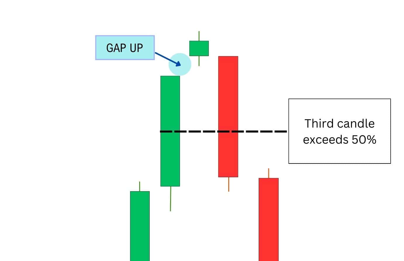 3. The third candle is a large bearish candle which exceeds the midpoint of the first candle’s body. It confirms weakness in the asset and provides a clear entry or exit signal. It is always red.