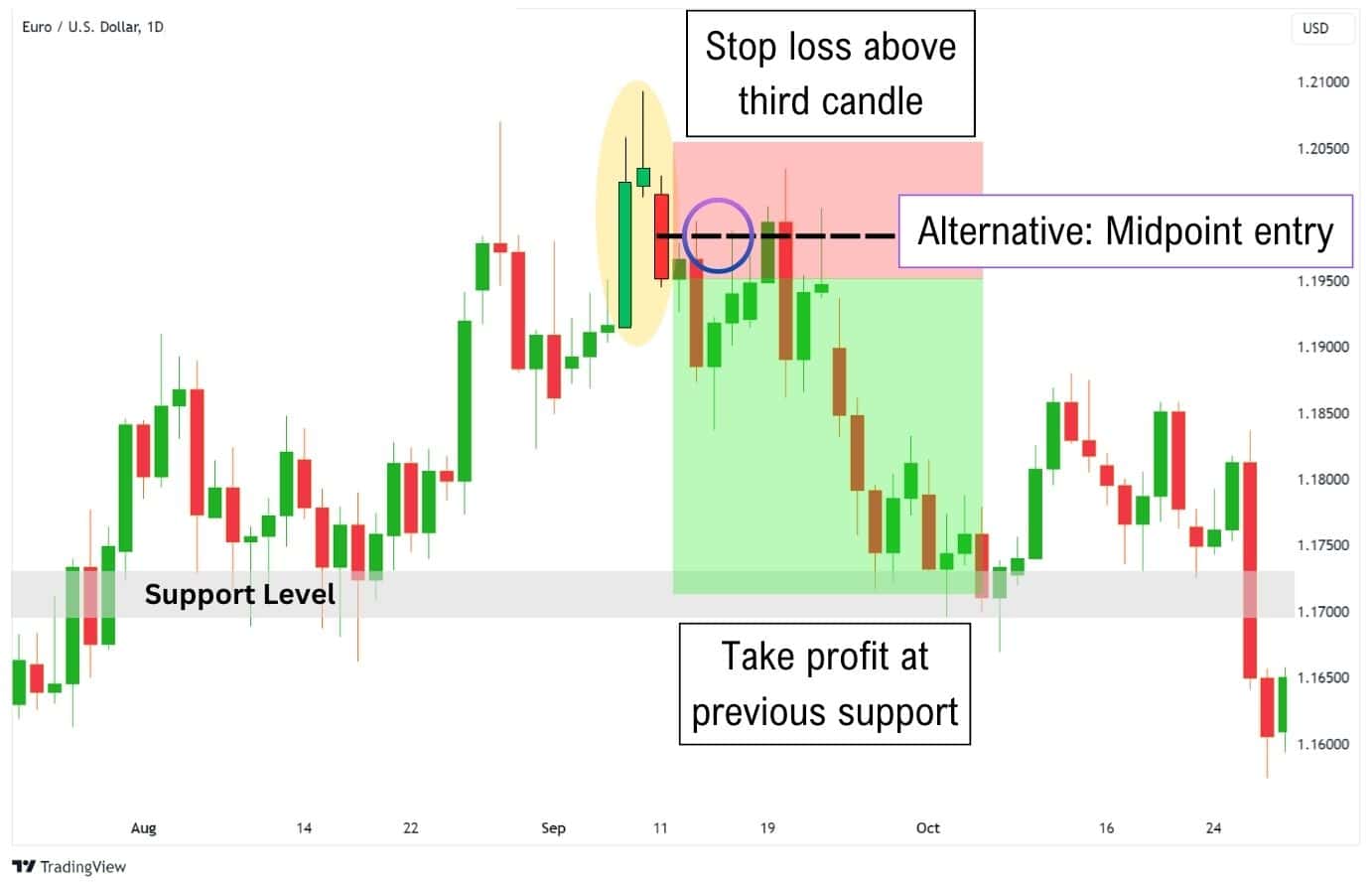 4. (Optional) Wait for price to retest, then reject from the midpoint of the third candle’s body. This can protect you from being stopped out prematurely. However, it can lead to worse entries or missed opportunities.